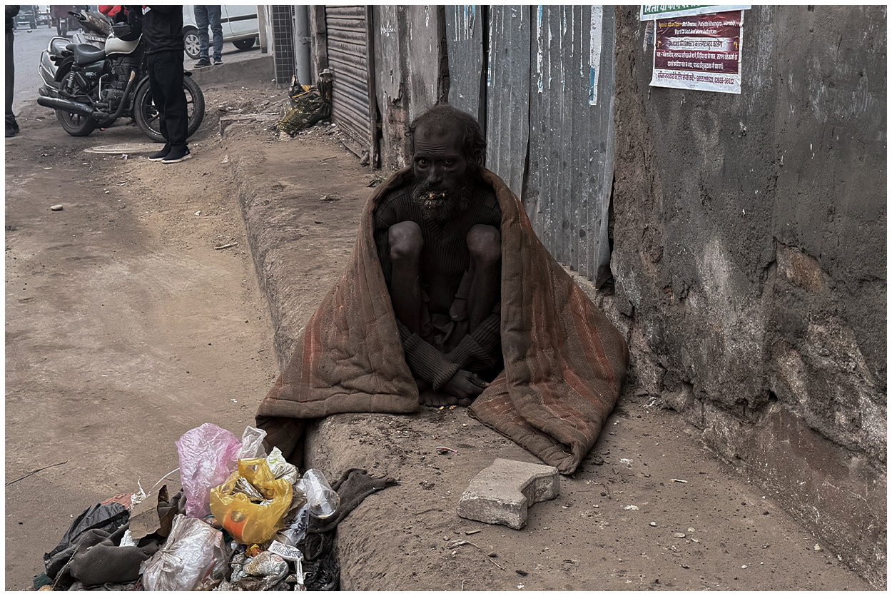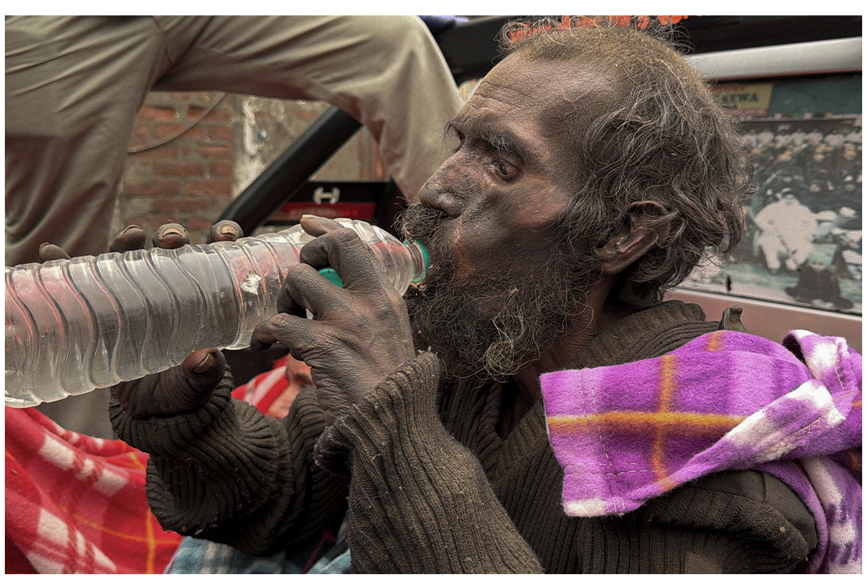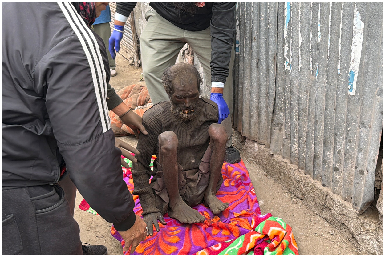 The elderly man is mentally disturbed and is also unable to walk or move properly. He was completely covered in dirt, his body darkened by dust and neglect. Sitting alone by the roadside in the severe cold, abandoned and helpless, he had been reduced to nothing but skin and bones. There was no one to care for him, no shelter, and no support to protect him from hunger, illness, or the harsh weather.