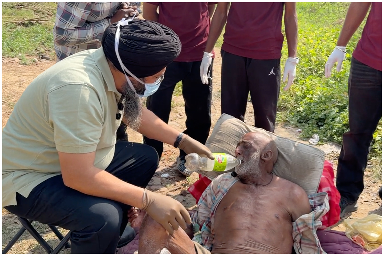 While talking to Bapu Ji, he told us that his name is Tarunjit Singh and he is a resident of Model Gram, Ludhiana. According to him, his wife Inderjit Kaur and his son Ankur left him here and went away. It is heartbreaking to imagine what kind of wife and son could abandon him in such terrible conditions and leave him helpless on the roadside. If anyone knows or recognizes Bapu Ji, please kindly come forward and visit him.