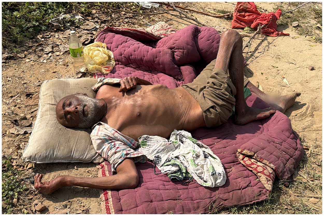 Bapu Ji was found lying on a barbed wire fence, and worms were eating into his body. His condition was extremely critical, and he was struggling to breathe. Because he had been lying on the barbed wire, his entire body was badly scraped and injured. There are also large wounds on the back side of his body, which appear to be quite old, and maggots have developed in those wounds.