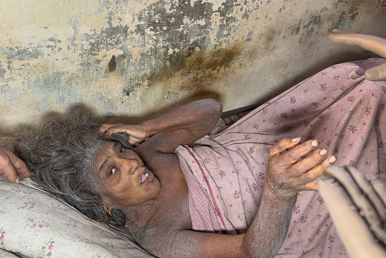 This mother was living a life worse than hell within her own home. Her head was infested with lice to the point that large clumps had formed, and her entire body was covered with worms. Lying on an extremely dirty and unhygienic bed, she kept scratching her body in pain.